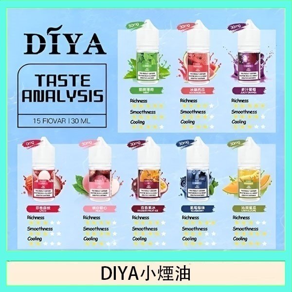DIYA叮啞全新推出 15 種口味小煙油,0-50MG 尼古丁鹽濃度選擇,滿足不同需求。